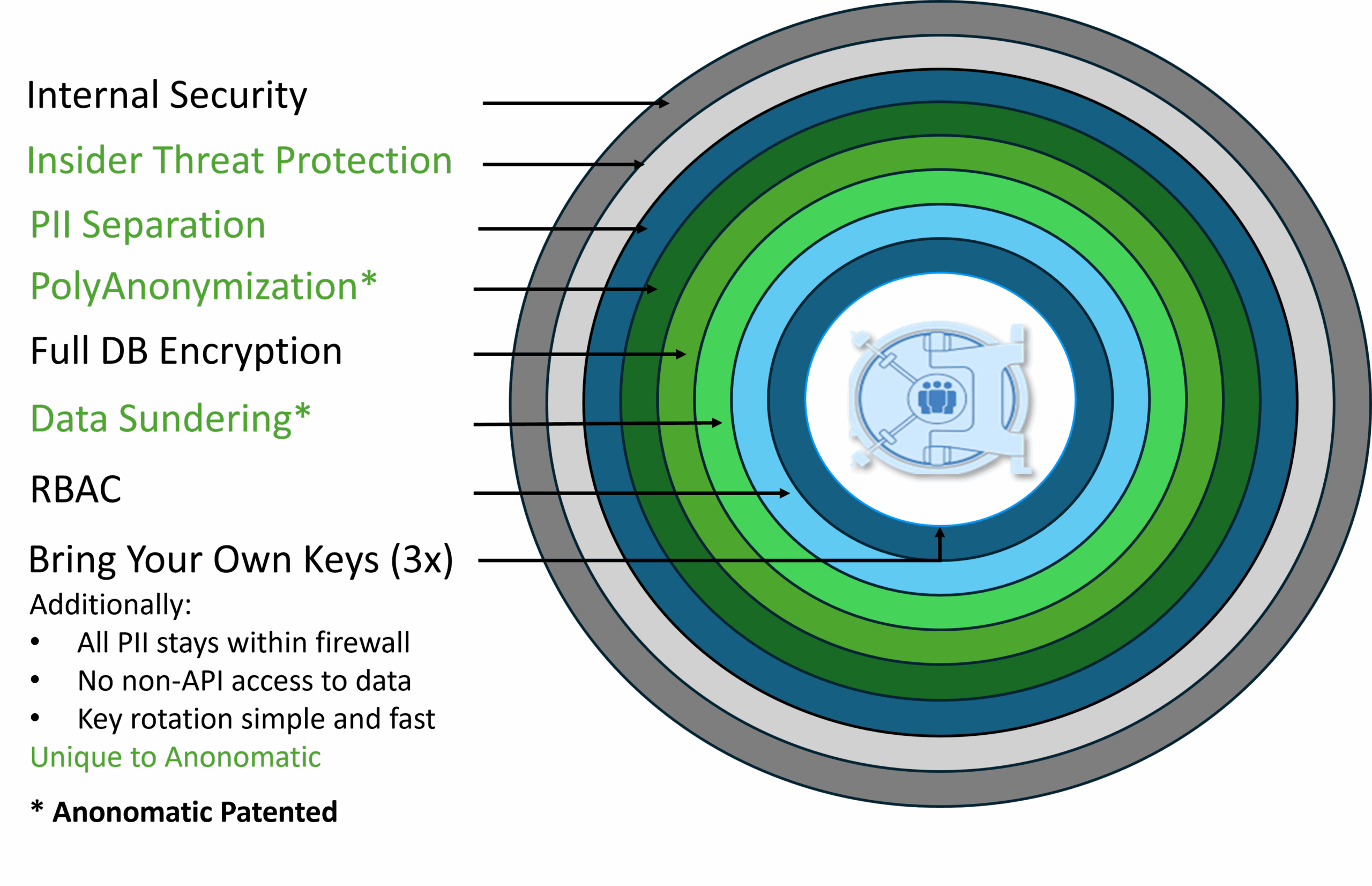 This is where the data security of most systems starts and stops. It is in the middle of our model and ensures that Anonomatic PII Vault is NIST-compliant. We know, the NSA told us so.